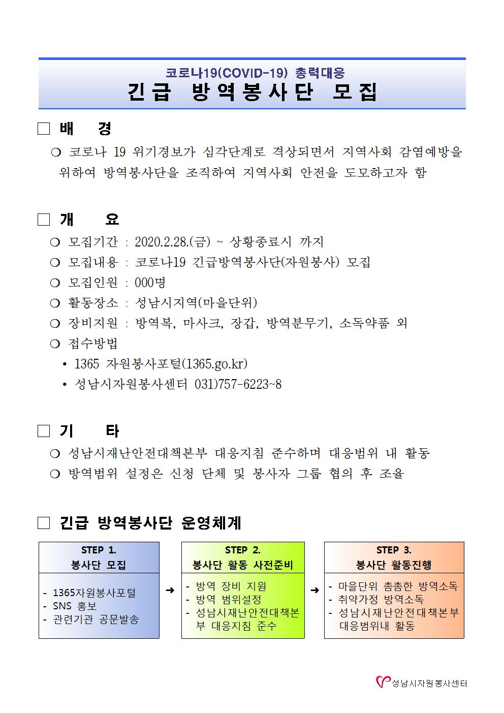 [공지] [성남시] 코로나19(COVID-19) 총력대응 긴급 방역봉사단 모집