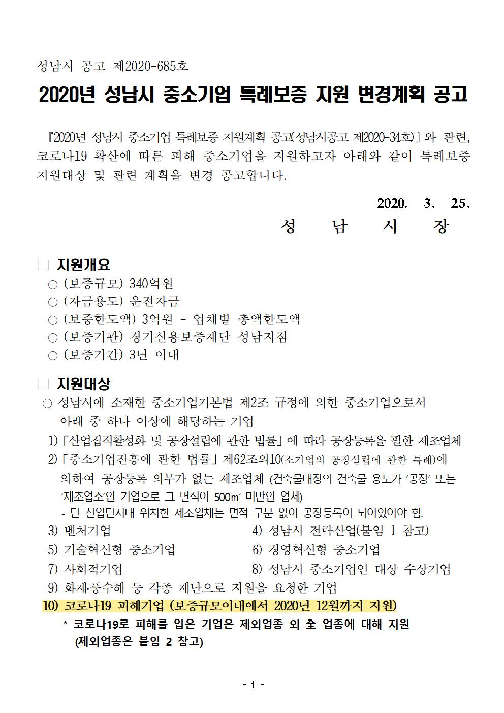 [공지] [성남시]2020년 성남시 중소기업 특례보증 지원사업 공고문