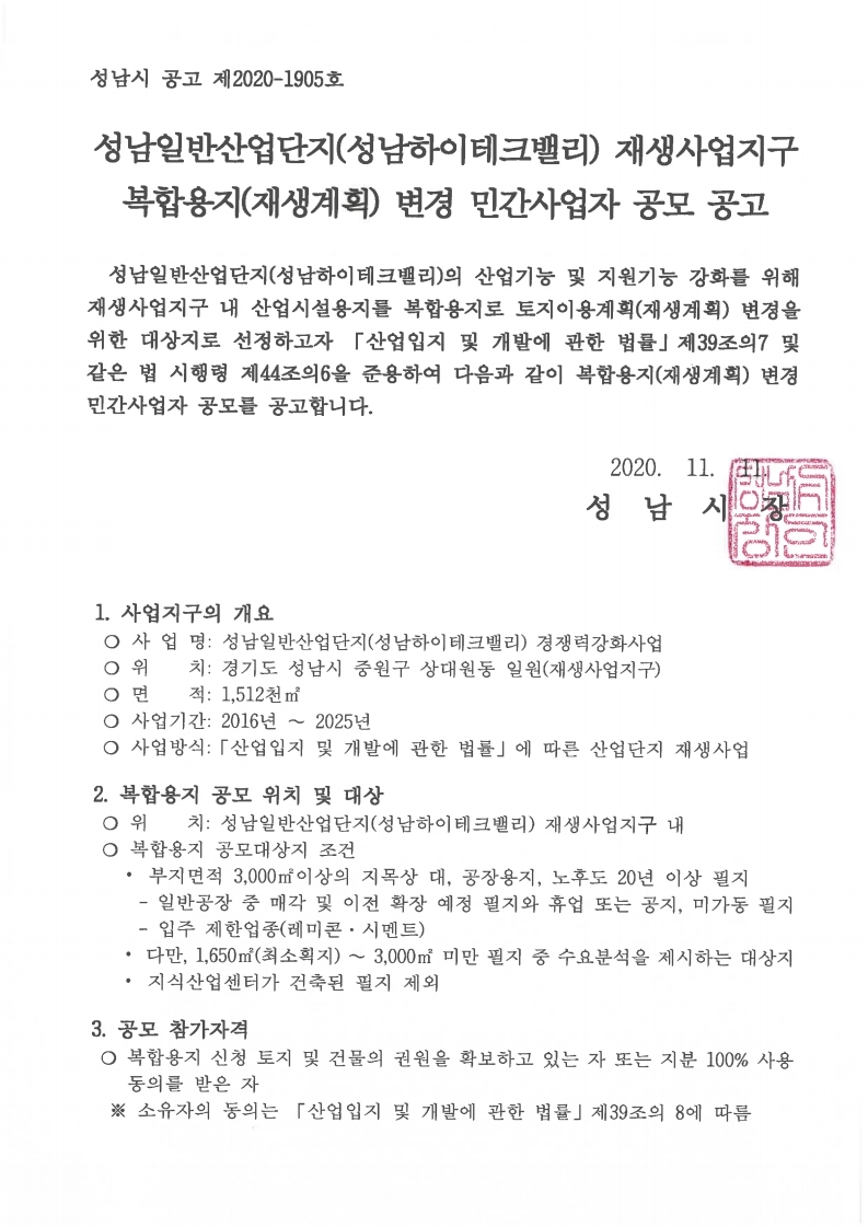 [공지] 성남하이테크밸리 재생사업지구 복합용지 변경 민간사업자 공모