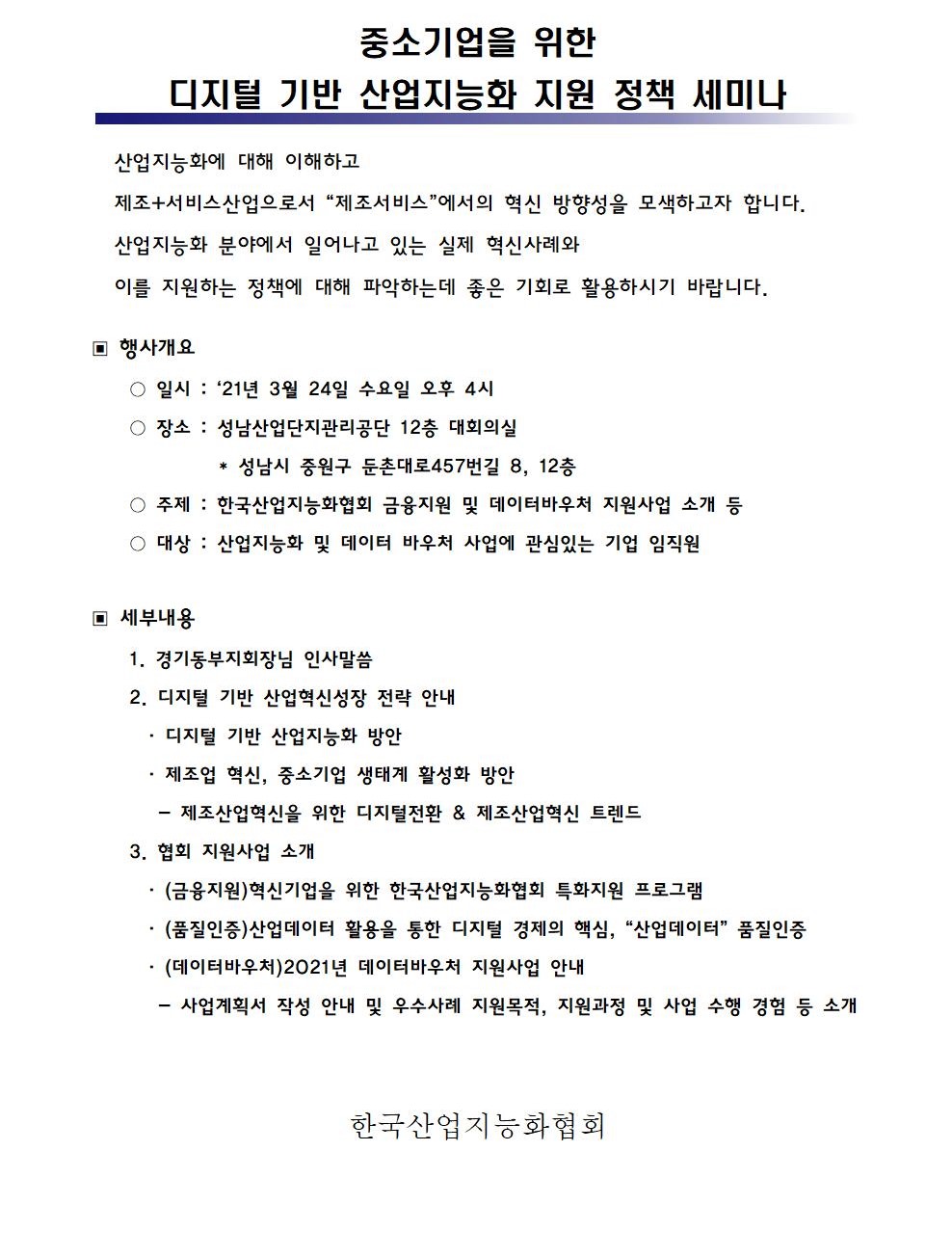 [행사] 중소기업을 위한 디지털 기반 산업지능화 지원 정책 세미나 안내