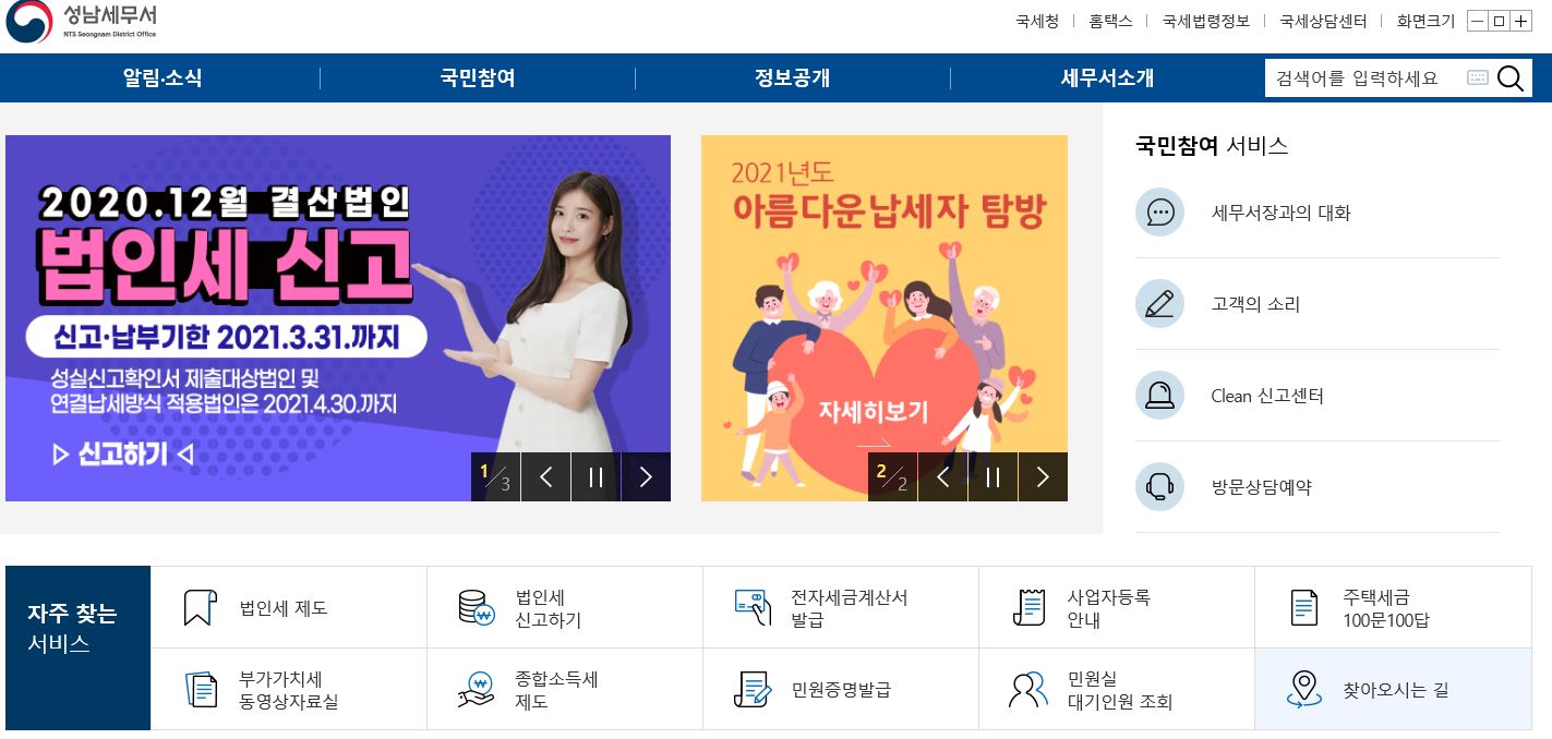 1. 성남세무서 홈페이지(https://j.nts.go.kr/seongnam/main.do) → 자주찾는서비스 → 법인세 제도