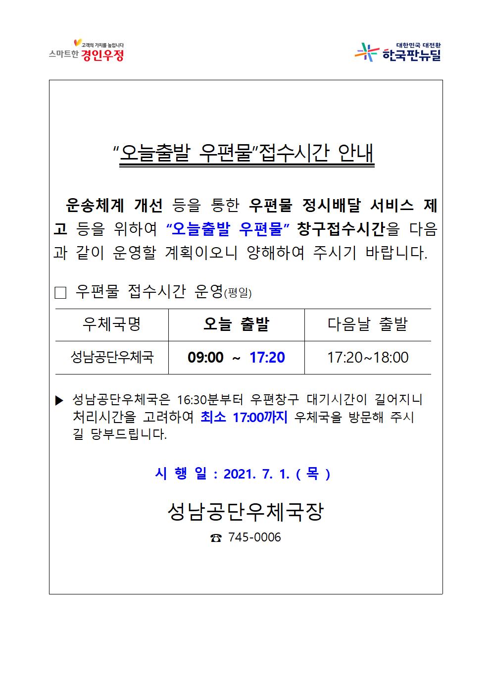 [공지] [성남공단우체국]오늘출발 우편물 접수시간 안내