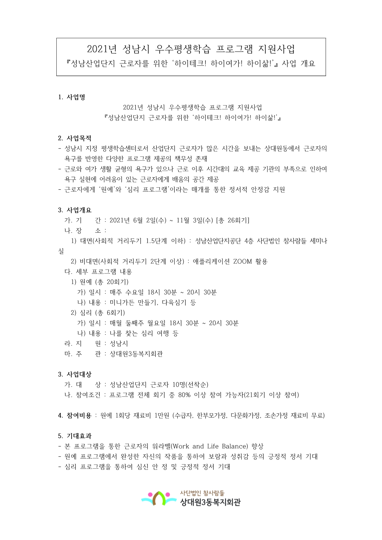 [공지] 성남시 우수평생학습 프로그램 지원사업 『성남산업단지 근로자를 위한 "하이테크! 하이여가! 하이삶!" 』 프로그램 안내