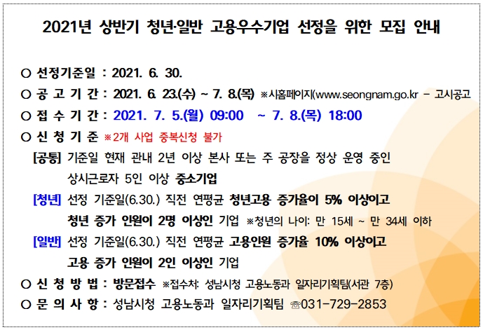 [공지] 2021년 상반기 청년/일반 고용우수기업 모집 공고