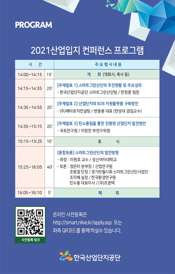 참여방법 : 사전등록 후 행사 당일 Youtube 한국산업단지공단 채널 실시간 중계 영상 시청(사전 등록 후 당일 참여 하신 분에 대해 추첨을 통해 경품 제공)