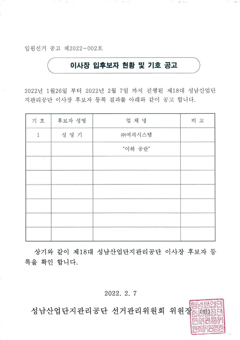 [공지] [임원선거 공고 제2022-002호]이사장 입후보자 현황 및 기호 공고