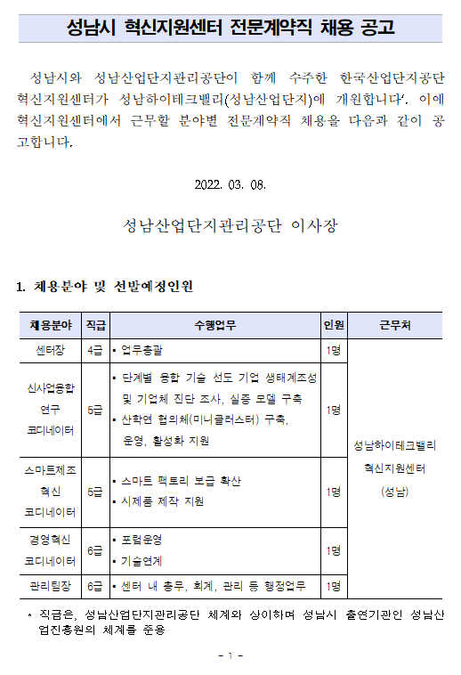 성남시와 성남산업단지관리공단이 함께 수주한 한국산업단지공단 혁신지원센터가 성남하이테크밸리(성남산업단지)에 개원합니다`. 이에 혁신지원센터에서 근무할 분야별 전문계약직 채용을 다음과 같이 공고합니다.