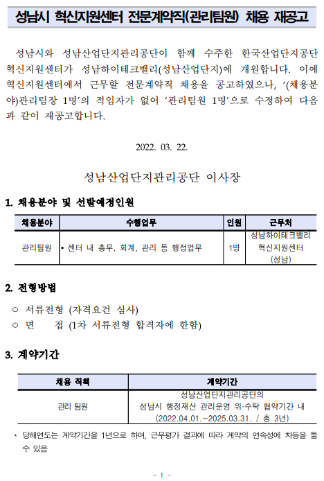 성남시와 성남산업단지관리공단이 함께 수주한 한국산업단지공단 혁신지원센터가 성남하이테크밸리(성남산업단지)에 개원합니다. 이에 혁신지원센터에서 근무할 전문계약직 채용을 공고하였으나, ‘(채용분야)관리팀장 1명’의 적임자가 없어 ‘관리팀원 1명’으로 수정하여 다음과 같이 재공고합니다.
