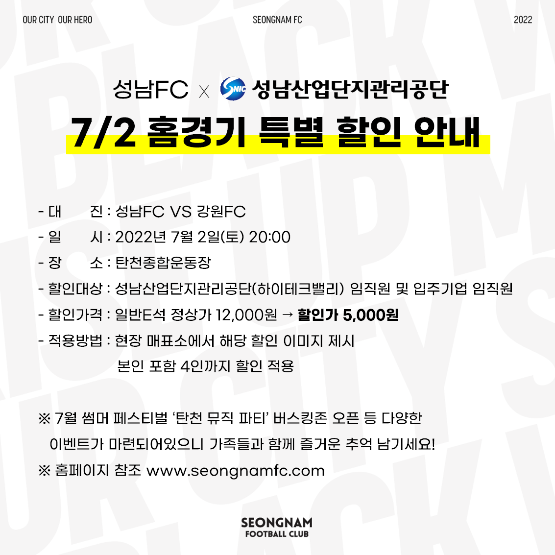 [공지] [성남FC]2022년 7월 2일(토) <성남FC VS 강원FC> 성남 홈경기 특별 할인 안내