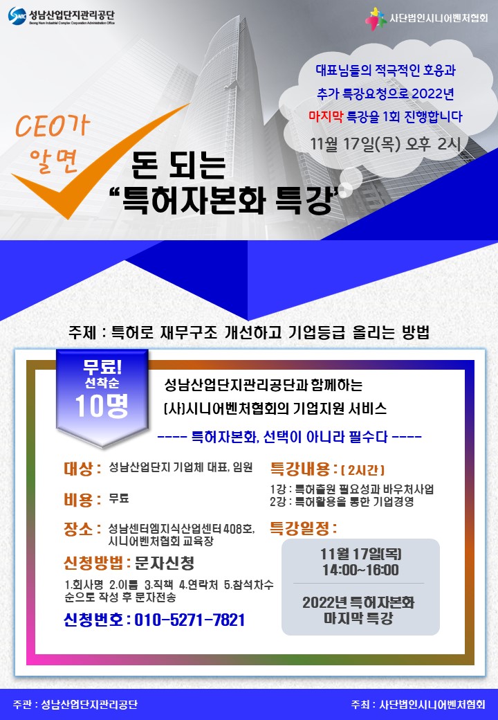[교육] (추가특강요청)알면 돈되는 특허자본화 특강 11/17(목)