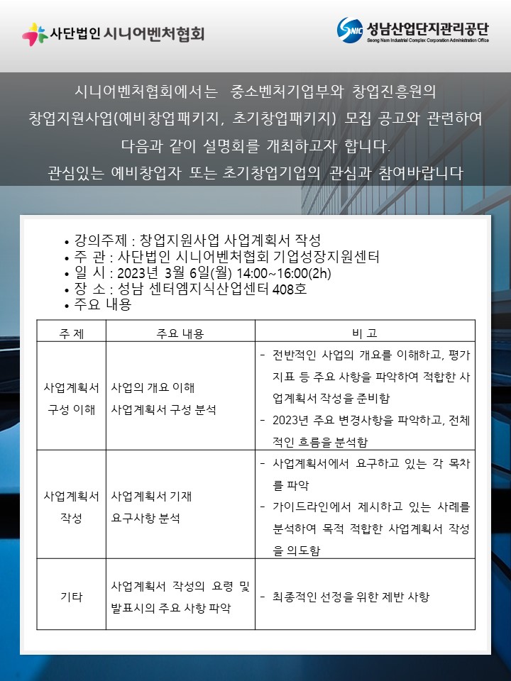 [공지] 중소벤처기업부 창업지원사업 계획서 작성 교육 및 설명회 개최