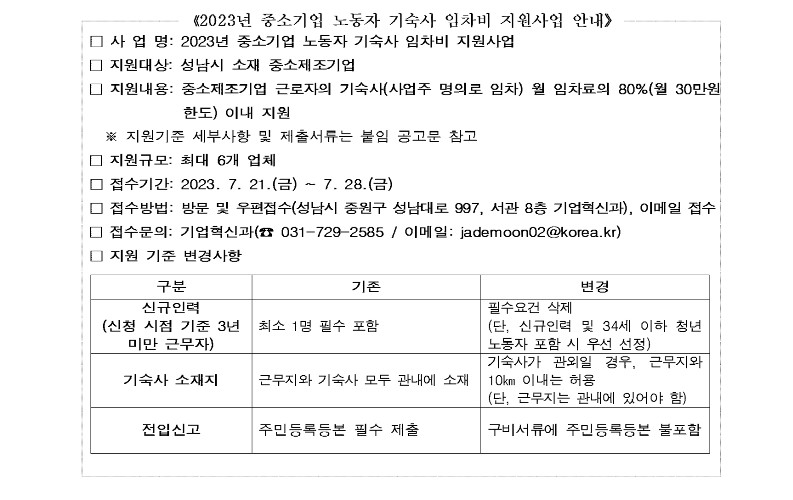 [공지] [협조]2023년 중소기업 노동자 기숙사 임차비 지원사업 재공고