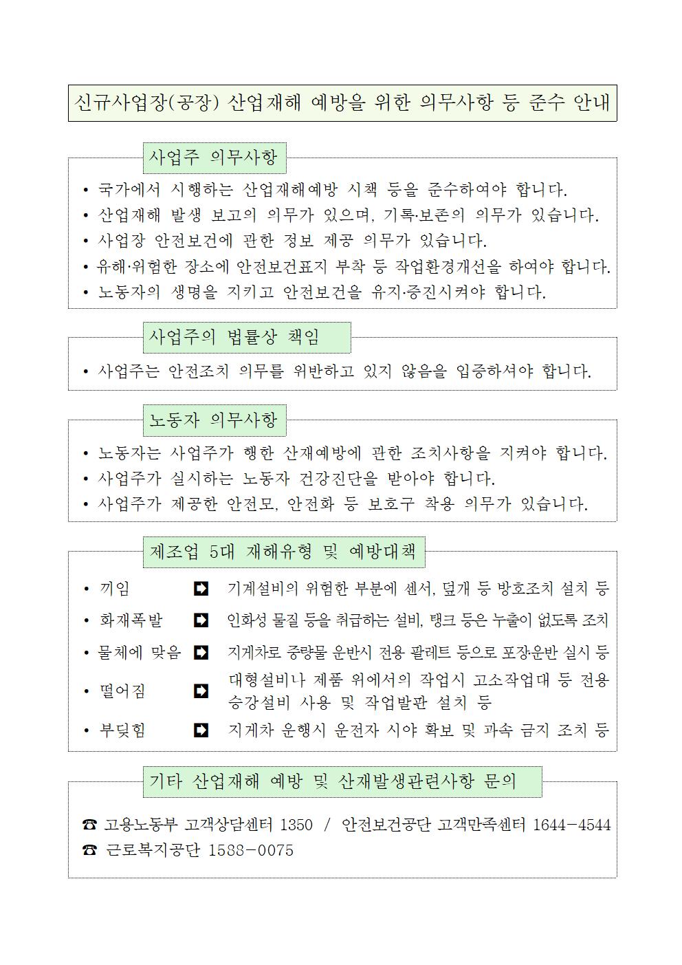 [공지] 신규 사업장(공장) 산업재해 예방을 위한 의무사항 등 준수 안내