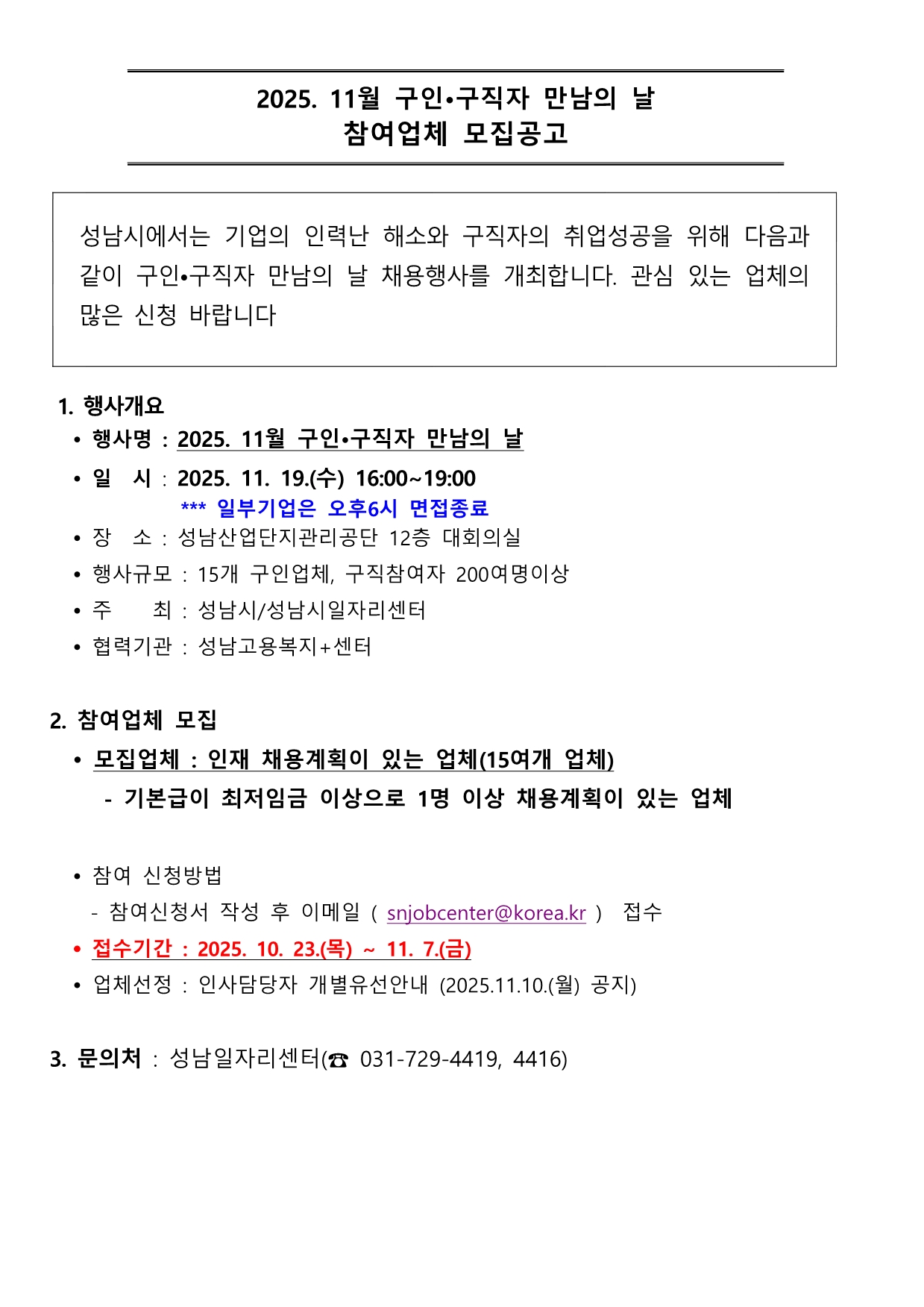 [공지] 2025년 11월 구인구직자 만남의날(취업박람회) 참여업체 모집 공고